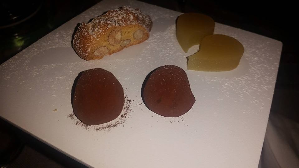 La piccola pasticceria è composta da cantucci, tartufini e gelatine alla pera mentre le caramelle gommose nei vasi di vetro completano il pasto, chiudendolo una colorata dolcezza che non ti aspetti.