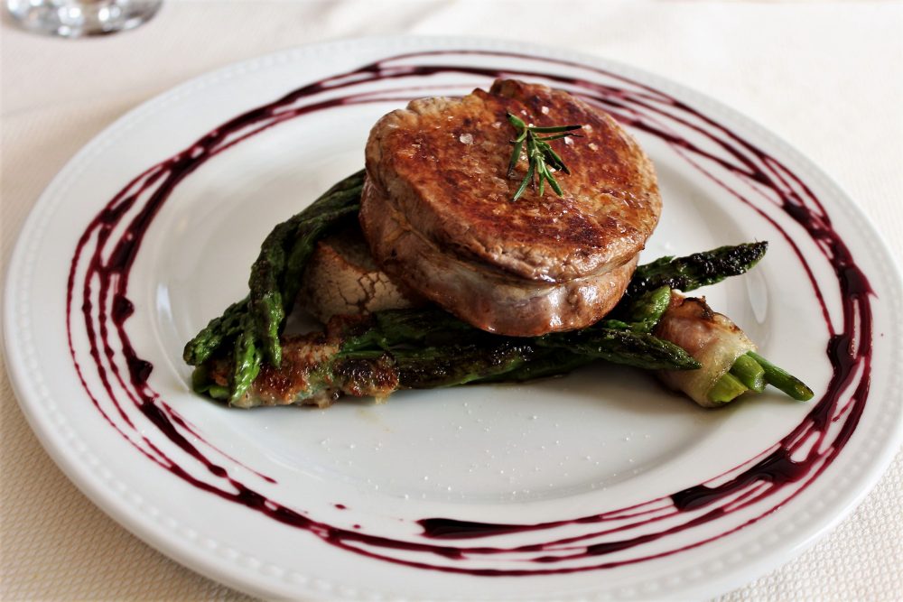 Filetto, asparagi e guanciale: filetto di manzo, della già menzionata Macelleria Passarella, scottato in padella e condito con solo sale di Maldon e olio evo, servito su asparagi di coltivazione locale fasciati da guanciale di maiale casertano di Tomaso Salumi da Faicchio e finito con una riduzione di Pallagrello nero della citata Cantina “Luongo” di Raviscanina.