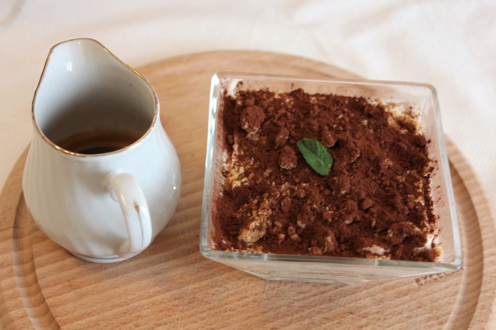 Interpretazione di Tiramisù: mousse di ricotta vaccina, con crumble di nocciole di Vairano e cacao amaro con caffè caldo, versato al momento.