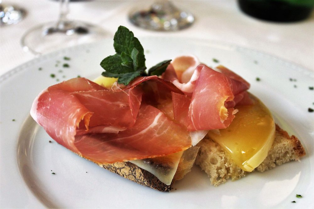 Masseria Mastrangelo il crostone con crudo di Petraroja e caciocavallo