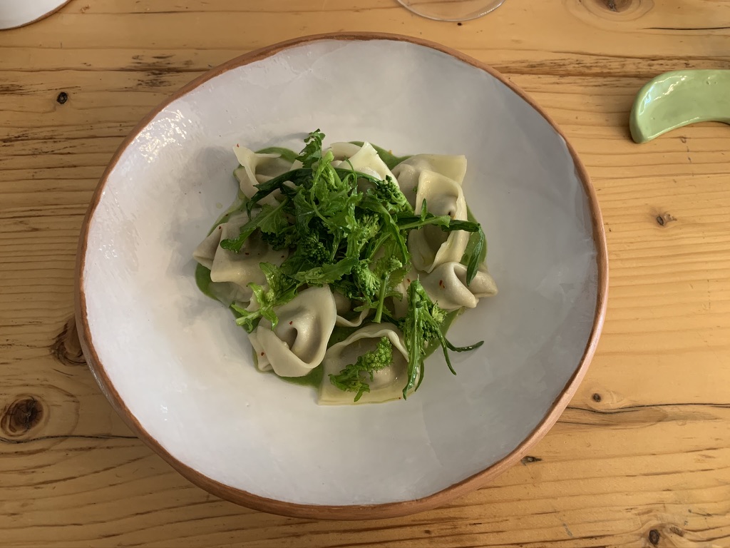 Cappellacci di melanzane affumicate, crema friarielli e friarielli crudi: piatto complesso, con note dolci, amare, acide, piccanti; soprattutto inatteso il persistente erbaceo di cime e foglie dei friarielli crudi che rendono il piatto lungo e nettamente memorabile.