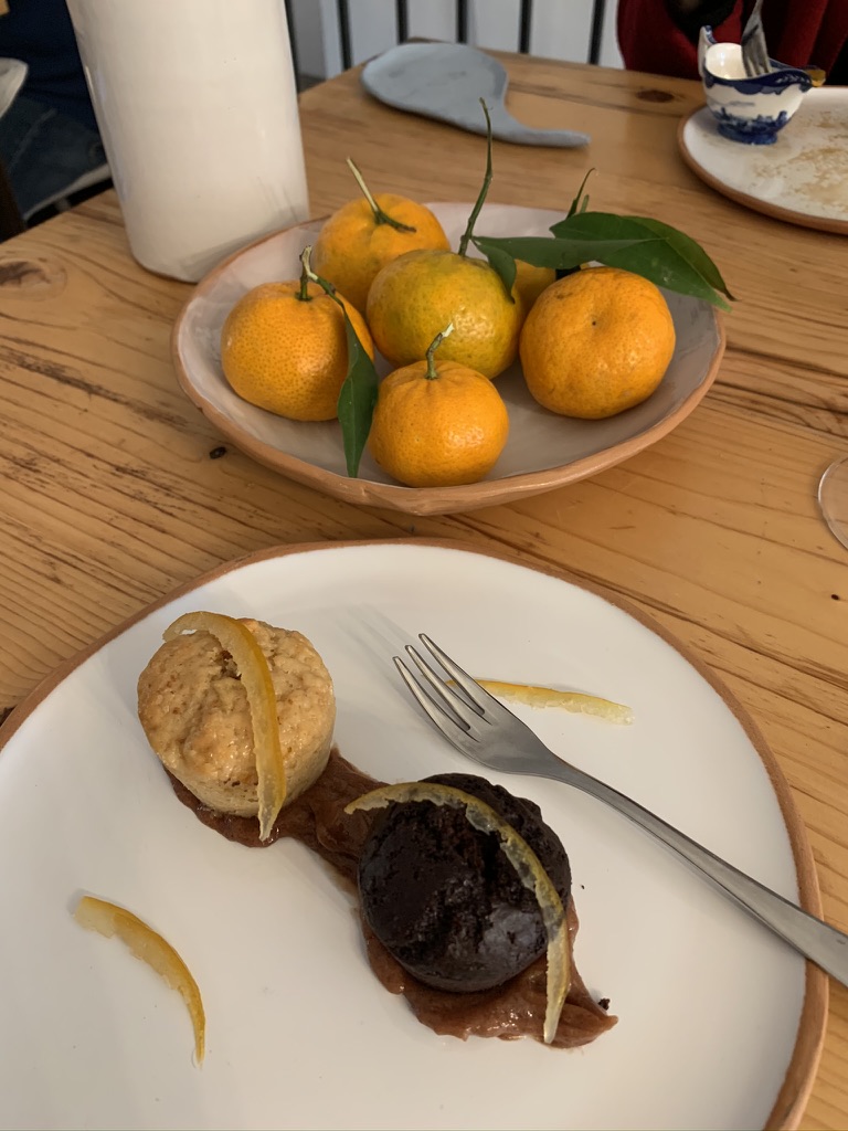 Muffin al mandarino e al cioccolato su composta di fichi: piacevoli e golosi, serviti con mandarini dell’agrumeto di famiglia, del quale apprezzare le varietà che si differenziano per dimensione, gradi di dolcezza e acidità, profumo, consistenza degli spicchi: uno stuzzicante gioco di fine pasto che porta a non saziarsi mai!