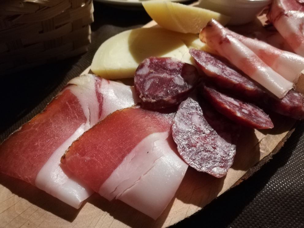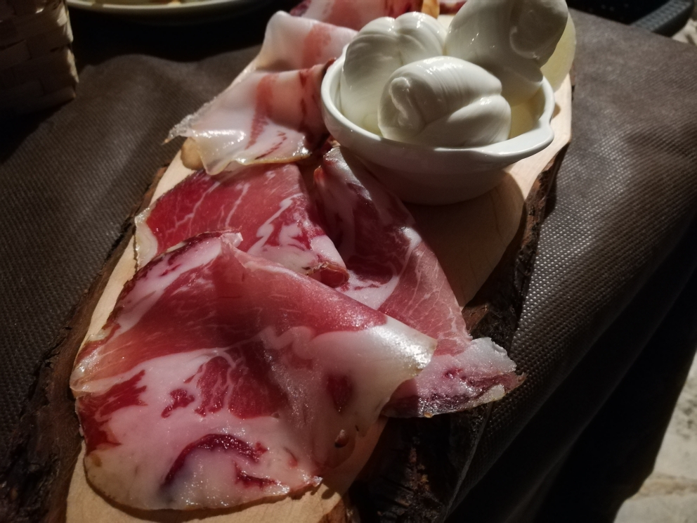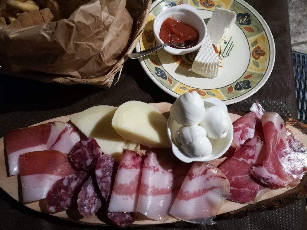 Si continua con l’antipasto della casa composto dagli eccellenti salumi (lonza, pancetta, salsiccia secca, capocollo) e formaggi (i tradizionali nodini, un caciocavallo stagionato e un cacio-ricotta con una composta di mela cotogna).