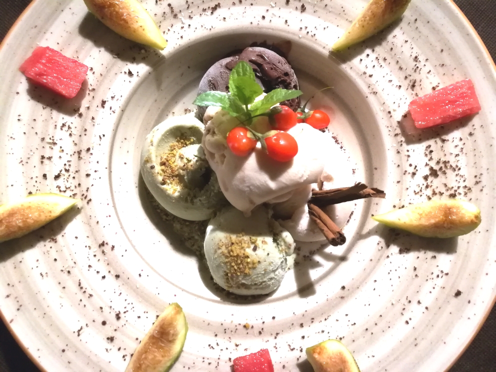 Per finire ci deliziamo con una composizione di gelati artigianali fatti con il latte delle proprie vacche dal sapore unico. I gusti sono: cioccolato, nocciola, pistacchio e pera-cannella. Le decorazioni sono: fichi freschi, anguria, stecche di cannella, menta e bacche di Goji fresche.