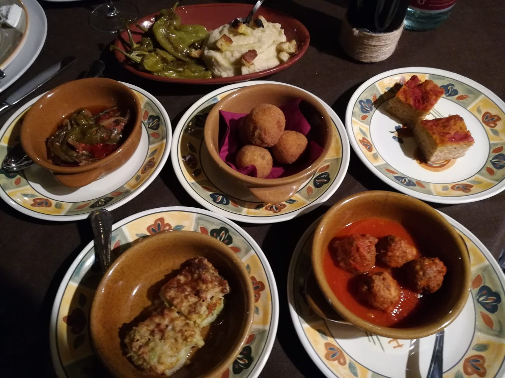 In sequenza vengono poi portati dei tegamini con : – Polpettine al sugo, – Peperoncini verdi con cipolla e pomodorini, – degli arancini di riso artigianali, – la Focaccia, – lo Sformatino di Cavolfiori, – e la tradizionale purea di Fave accompagnata dai peperoncini verdi friggiarelli.