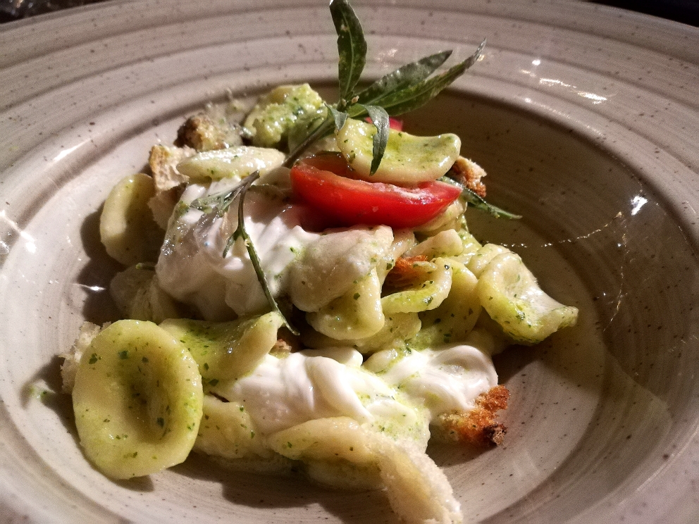 Tra i primi ci sono le Orecchiette con la Braciola, ma desiderando un condimento diverso osiamo e ci affidiamo allo chef che riesce ad accontentarci con una splendida creazione con trito di zucchine, pomodorini, rucola di campo e la tipica Stracciata che si trova anche nelle tradizionali burrate.