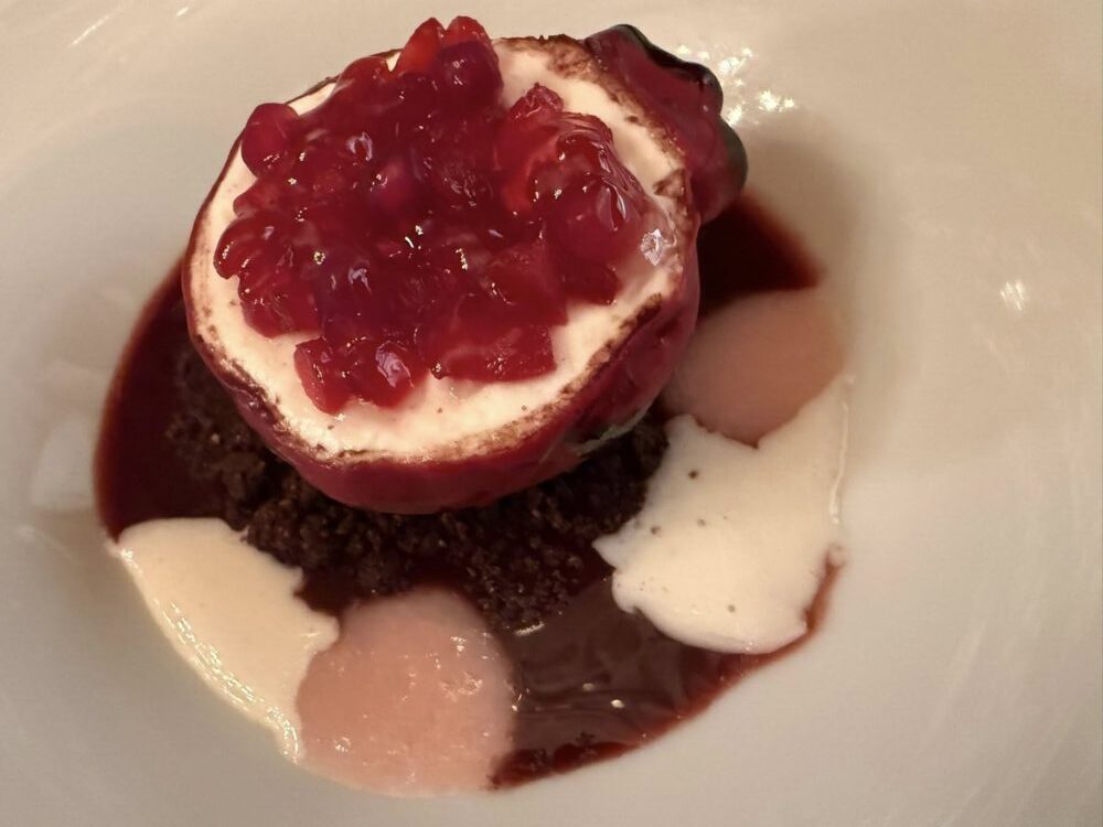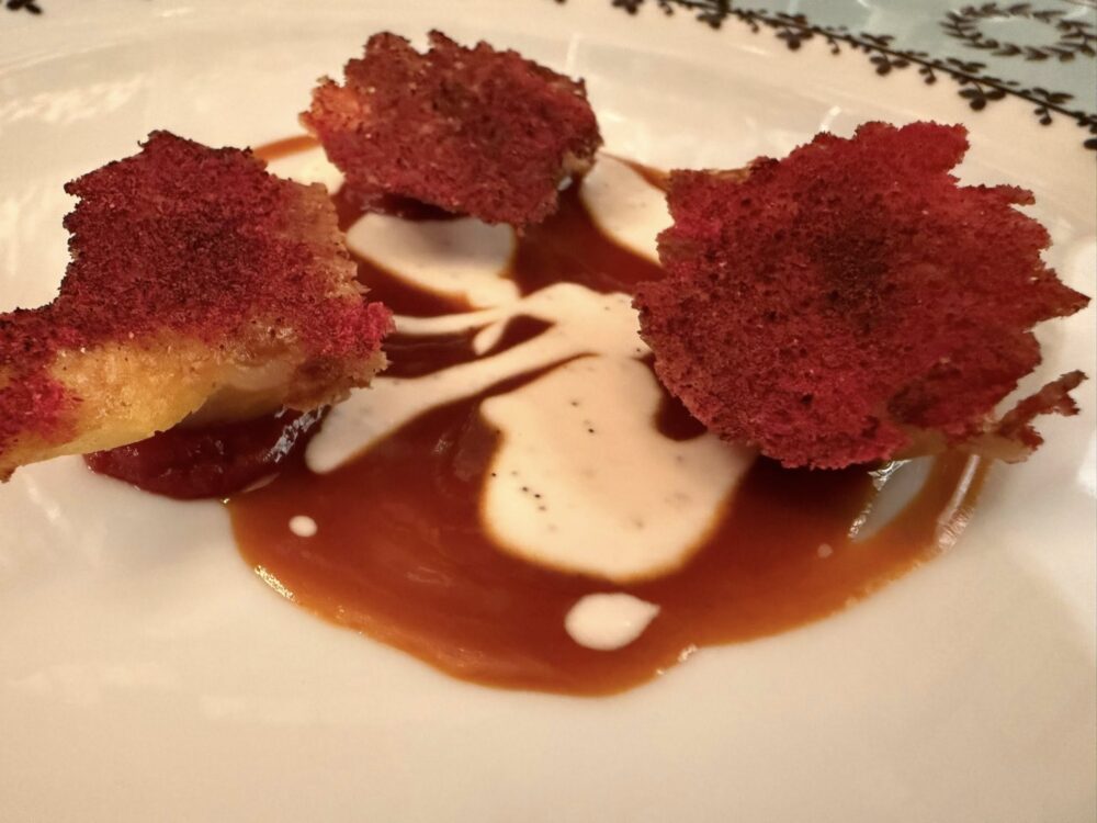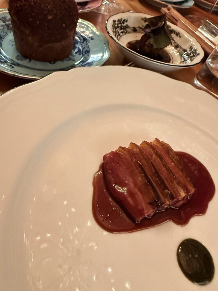 Highlights assoluti, “pane e acqua”, provocatoria nel concetto come la Gioconda di Duchamp, evocativa dello storico “camouflage”; “dove vuole andare questa pasta e fagioli?” Senza fagioli, con la loro idea ricostruita e un brodo irresistibile e “Jazz Duck-improvvisazione sull’anatra” che è una mostruosità di gola e goduria, tra fondo (quasi rosso come Fontana) e panettone da scarpettare tutto l’anno.
