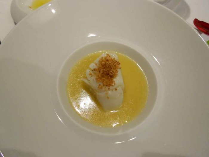 Aulla in carpione (pesce di lago) in tempura con gelato di aceto e cipolle, su base croccante (dal menu “Classici”): chi ben comincia è già a metà dell’opera, ma non voglio che finisca quest’opera; grande equlibrio e scelta perfetta dei contrasti croccante-morbido e freddo-caldo.