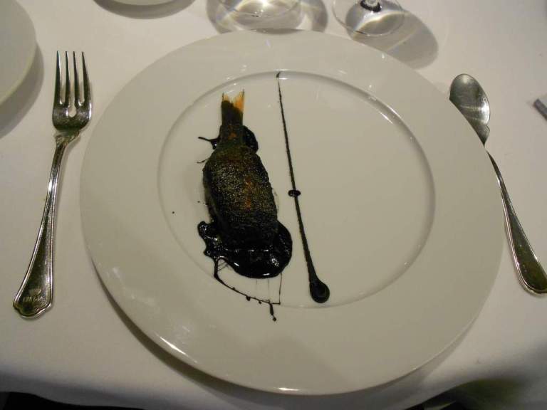 “Come Bruciare le Sarde in Tre Giorni” (dal menu “Sensazioni”): è un piatto provocazione, come ci dice lo stesso Massimo Bottura, ed infatti in realtà non sono sarde quelle che troviamo nel piatto, ma triglie, scottate, farcite con crema di scampi e ricoperte di nero di seppia ed alghe. Qui comincia il gioco di “Immagine e Somiglianza del Menu “Sensazioni” che riprenderemo più avanti.