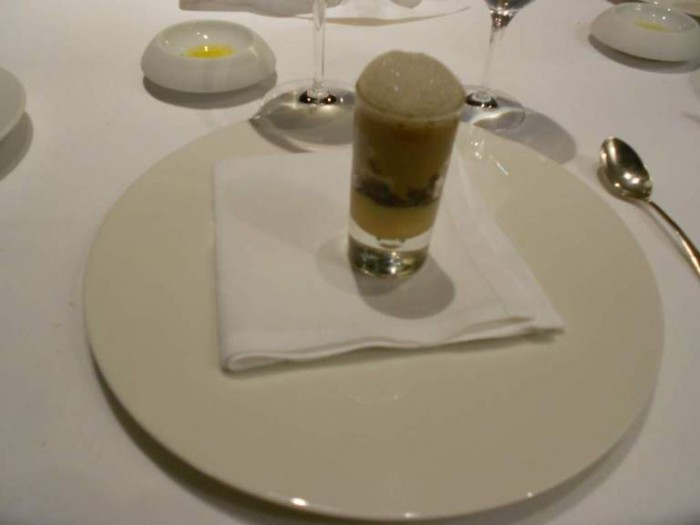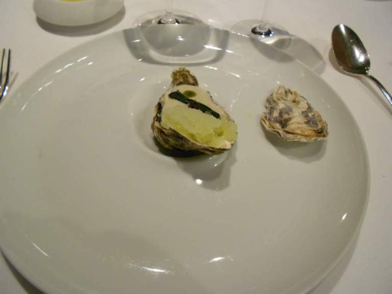 “Normandia” (dal menu “Sensazioni”): omaggio alla Normandia e più precisamente a Mont Saint Michel (si pesca dalla memoria) ed eccoci all’immagine e somiglianza. Ciò che si vede è un’ostrica ma in realtà nel piatto abbiamo un battuto di agnello presalée con emulsione di acqua filtrata di ostriche, caviale e olio extra vergine d’oliva, alghe fresche e granita di mela (sidro). Un tocco di menta per ricordare che nella tradizione nordica la menta accompagna l’agnello.