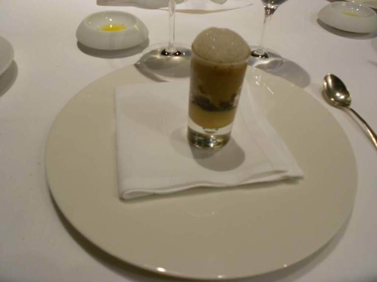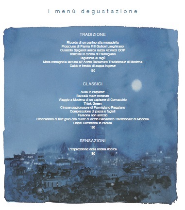 “Compressione di Pasta e Fagioli” (dal menu “Classici”): bicchierino con creme di consistenze diverse, da mangiare tutte insieme affondando il cucchiaio. Sul fondo il foie gras ed i maltagliati della nonna. Sopra una spuma di rosmarino. Si ha quindi un mix di influssi francesi (foie gras), spagnoli (la spuma) e della tradizione emiliana.