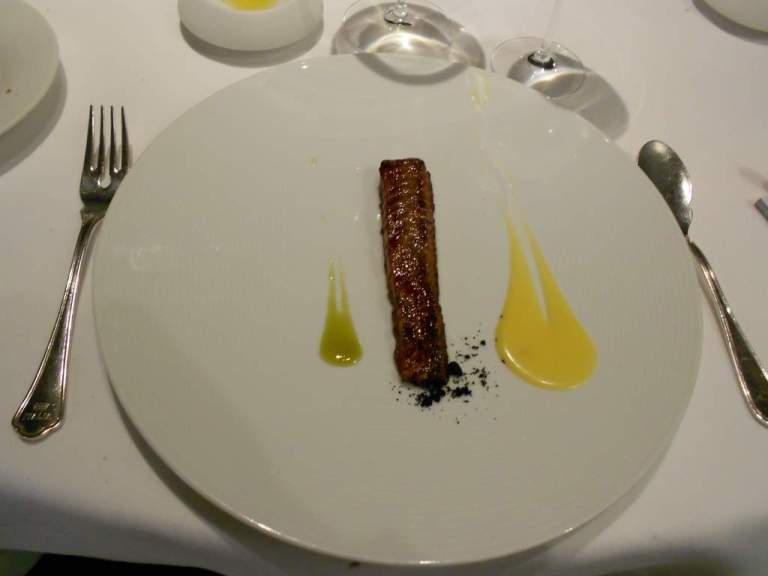 “Viaggio a Modena di un Capitone di Comacchio” (dal menu “Classici”): filetto di capitone, glassato con la saba, e cenere di cipolla bruciata. E’ la metafora dell’Anguilla che risale il Po’. Il giornalista giapponese in un altro tavolo, che casualmente assaggia il piatto nello stesso mio istante, esprime a Beppe Palmieri il suo commento sul piatto “La migliore anguilla mai mangiata in vita mia”. Io mi associo al pensiero nipponico, ed aggiungo che difficilmente si riesce a coniugare così abilmente semplicità con originalità.