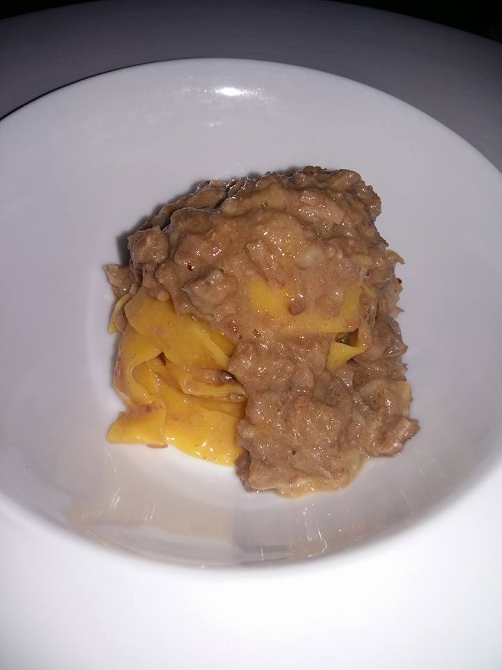 Impossibile non menzionare “le tagliatelle post moderne”, i “super tortellini alla panna”, “la parte croccante della lasagna” o il “ricordo di panino alla mortadella”, in cui la tradizione viene guardata da lontano con uno sguardo critico, non per denigrarla ma per provare a migliorarla, in termini di leggerezza e purezza del gusto. Fino ad arrivare ai dolci e, in special modo, “ops mi è caduta la crostatina”, che resta il mio dolce preferito in assoluto, nella ristorazione.