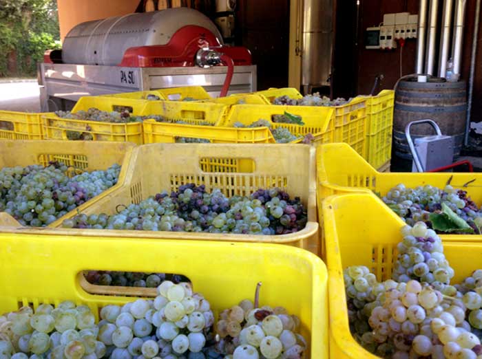 Il cortile della Cantina è assolato, sotto il porticato la luce, data l’ora, batte ancora radente sulla “macchina fabbricatrice del nettare di bacco”, sul sistema di pompe e, fortunatamente, non ancora sulle cassette d’uva (pallagrello bianco) che, in posizione strategica attendono di “tuffarsi”, al più presto, nelle pompe per essere sofficemente pressate nel contenitore pneumatico rotante che le trasformerà prima in mosto e successivamente in quello che suole chiamarsi “vino fiore” ed infine in “vino”, che sosterà, per adeguato tempo, nelle bottiglie prima di essere degustato.