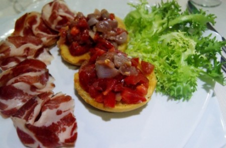 Si procede con gli antipasti di terra, dove si denotano eccellenze a cavallo tra la Puglia e la Lucania: capocollo lucano con fresella di pomodori e lampascioni; burrata con mandorle tostate, ficotto di Pisticci e fico; caprese a modo suo con crema di pomodoro, stracciatella, foglia di basilico fritta e pepe; sformato di pancotto e rape con peperone crusco e millefoglie di zucchine.