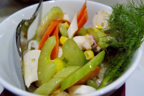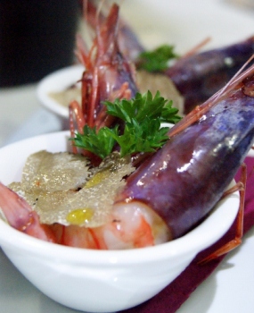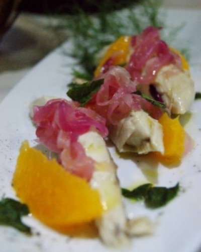 Si passa agli antipasti di mare ed è qui che lo chef evidenzia le sue potenzialità: gamberi rossi con prezzemolo riccio e tartufo calabrese; pesce cavallo con cipolla rossa di Tropea e spicchietti di arancia; salmone a cottura lenta a vapore, con aceto balsamico e pomodoro fresco; insalata di mare con verdure croccanti; un vero must sono le cozze gratinate con una panatura profumata e speziata.