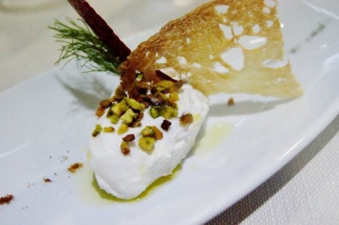 Qui svolge la sua prima esperienza da chef quando si ritrova a sopperire l’alzata di tacchi del primo cuoco. Ma quando il format della struttura cambia, Leo si guarda attorno fino a compiere la scelta azzardata di creare un ristorante a base di piatti di pesce. Azzardata perché in luoghi lontani dal mare è difficile procacciarsi materia prima fresca. Ed è per questo che tutti i giorni Leo, da un mese a questa parte, dopo il lavoro si mette in viaggio per Taranto dove si affida alla maestria dei suoi pescatori di fiducia, che gli garantiscono prodotti freschi e di alta qualità, così il menu varia a seconda del pescato del giorno. La cucina dello chef è caratterizzata da una continua ricerca di prodotti del territorio, realizzati secondo tradizione. Lo chef è un cuoco-girovago, per dirla alla Rosanna Marziale, gli piace sperimentare e questa caratteristica è ben evidente nei suoi piatti, come nella quenelle di ricotta di pecora con pistacchi di Stigliano, peperone crusco di Senise e una vela di pane di Matera Igp, che costituisce l’entrée con cui si apre il nostro pranzo.