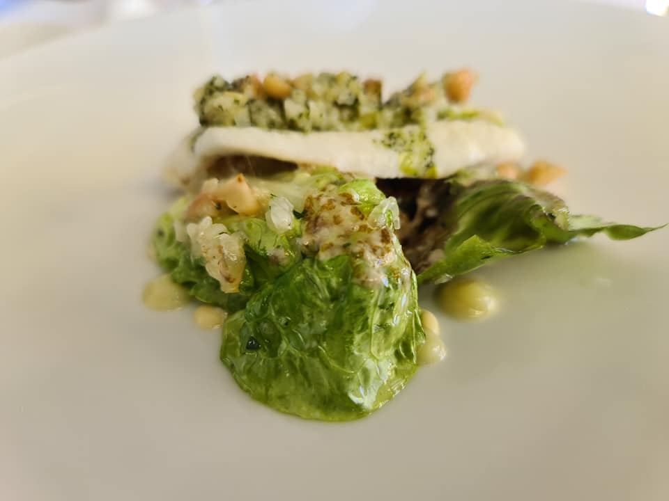 Sogliola al vapore, lattuga e bergamotto (dedicato a Piergiorgio Parini). Trasportato dal Lab 2020 anche nel 2021, le note vegetali diventano protagonista e la sogliola diventa il contorno, proprio come faceva Piergiorgio, valorizzando il mondo vegetale.