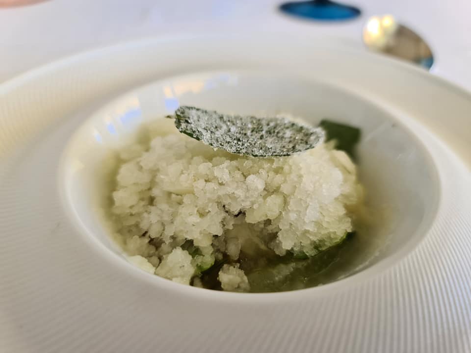 L’eleganza del riccio. Omaggio ad uno dei miei romanzi preferiti degli ultimi anni, l’Eleganza del riccio di scritto da Muriel Barbery nel 2006, un successo strepitoso con più di cinquanta ristampe e due milioni di copie vendute. La partenza è fulminante, violenta, potente. I ricci di mare, il limone che viene passato al Rotovac, ed in questa maniera mantiene intatte tutte le caratteristiche. La salvia sclarea, il limone bruciato e il levistico. Le nuance del piatto lasciano senza fiato, è un continuo gioco nel riconrrersi tra i gusti principali e su ogni gusto si apre una sfumatura. Meraviglierrimo!