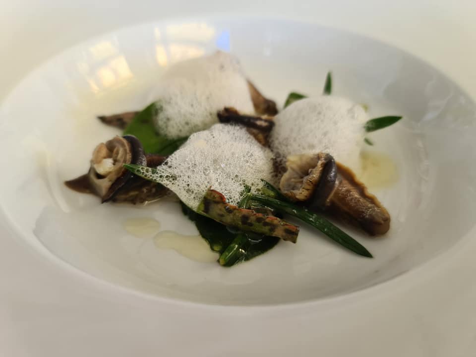 Lumache erbe di sabbia: finocchio marino, asparagi di mare, kalanchoe, ficoide glaciale. Un piatto difficile, che vuole esplorare la succulenza e la grassezza del mondo vegetale e per farlo usa le lumache, terragne, intense. Potenti le noti di salsedine che si scontrano con la terra. Quando un piatto è così difficile, trova questo equilibrio, diventa goloso. Questa è una vera magia.