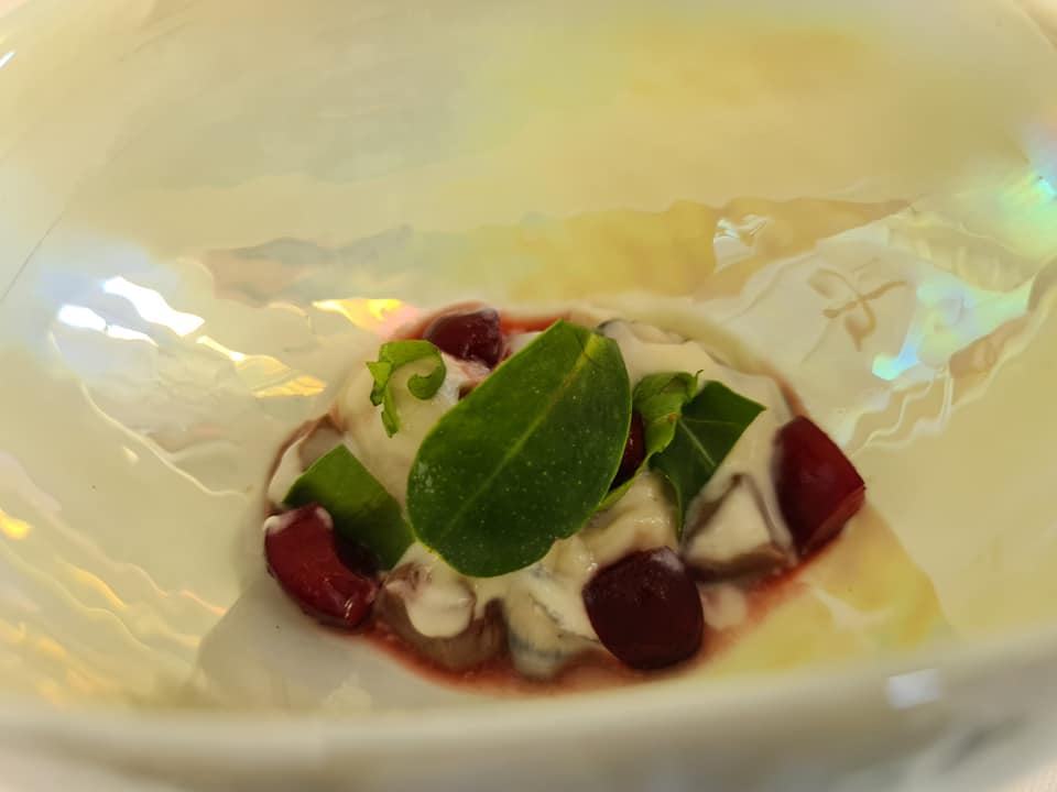 Ostrica, rafano, ciliegie, rognone di pecora. Continua, come nei precedenti Lab, il lavoro sulle ostriche, con uno sguardo che può avere un contadino su questi molluschi. Il rognone di pecora e leggermete scottato, le ciliegie ghiacciate servono a cambiare la temperatura e la consistenza nella masticazione, la parte vegetale allunga il gusto.