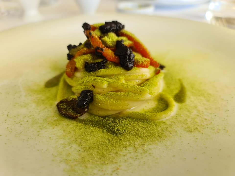 - spaghetti, nero di olive ai carboni, eucalipto, friggitelli e polvere di friggiteli