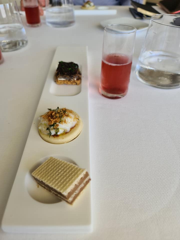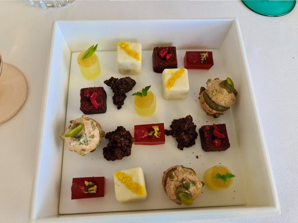 Loacker di fegato grasso e nocciole, lardo di polpo aglio e finocchio selvatico, alici e tartufo nero. Benvenuto super collaudato, non si sbaglia mai.