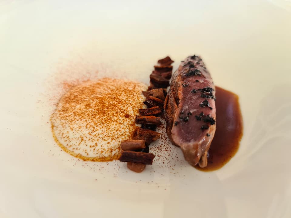 Colombaccio, paprica affumicata, rancido di prosciutto marchigiano e cruschi. Chiusura strong, come da consuetudine per il lab. Le sensazioni del rancido sono stupefacenti e fanno il paio con la forza del combaccio, cotto in meniera magistrale, la salsa ottenuta con l’aggiunta di umeboshi è come un’accelerazione di una formula 1, veemente. Un piatto di rara complessità e bontà.