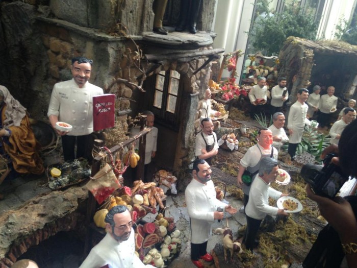Un presepe in cui ci sono alcuni dei grandi della cucina napoletana e che è dominato dalle uniche due figure di non chef: Stefano Bonilli ed Enzo Vizzari