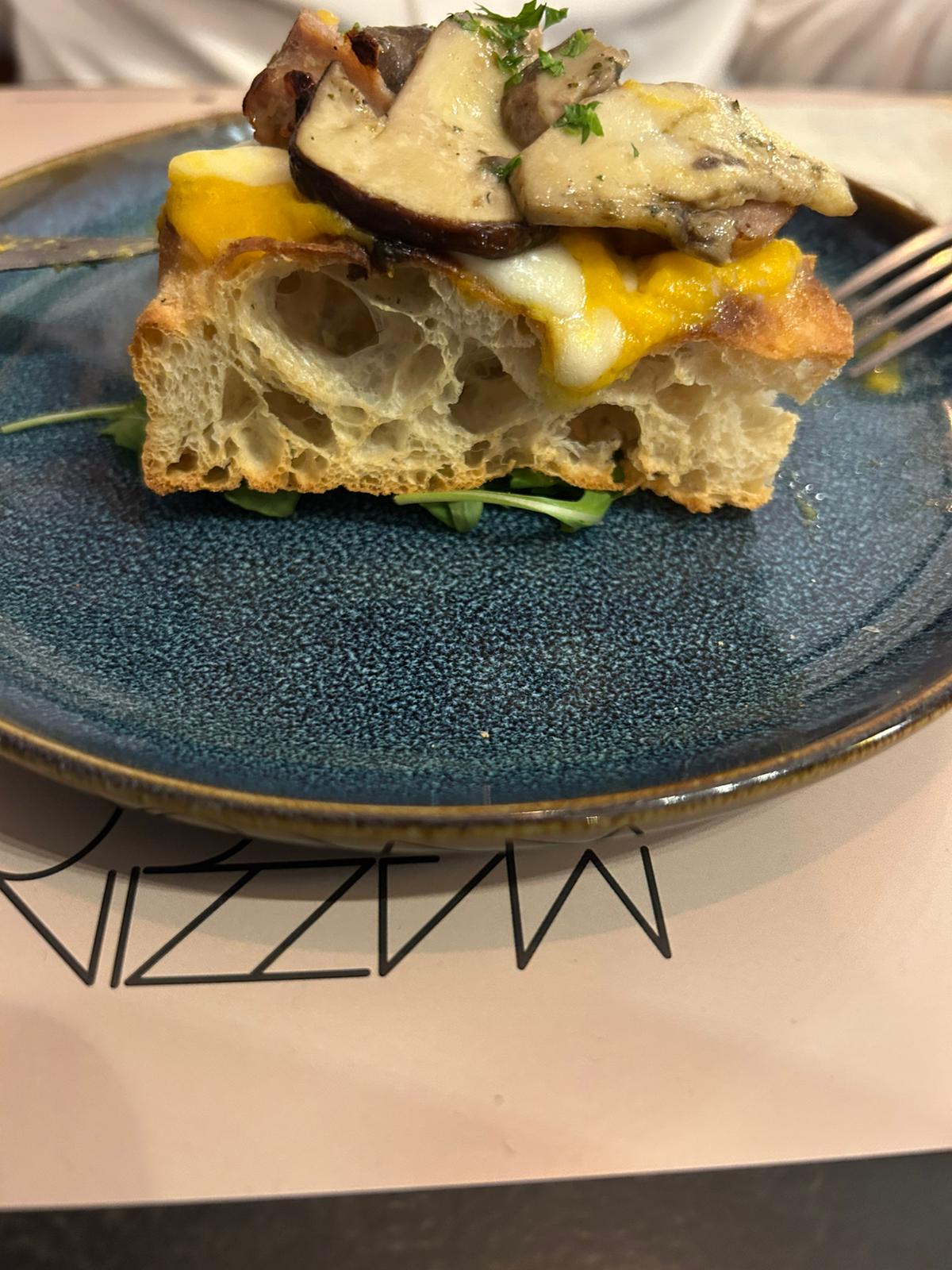 Straordinaria la pizza in pala, perfettamente alveolato l’impasto, e qui si evince la tecnica acquisita con grande determinazione da Davide, con crema di zucca, fior di latte, salsiccia di suino nero e un delizioso affettato di porcini appena raccolti.