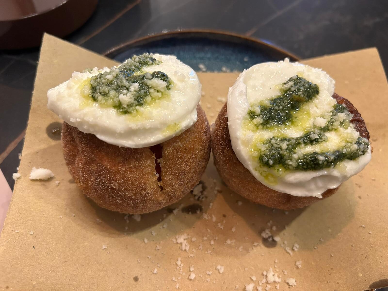 La degustazione è iniziata con le Montanarine: estratto di pomodoro, mozzarella di bufala iblea e pesto di basilico.