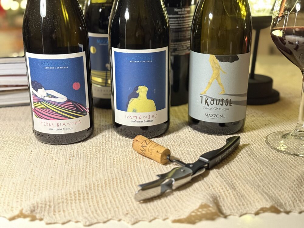 Il Minutolo, in particolare, entra in azienda nel 2007. È un vitigno raro, aromatico, delicato, che Francesco Mazzone conosce bene grazie agli anni di studio e di sperimentazione. «È un’uva che va capita», racconta, «perché se la forzi perde misura». Nel bicchiere, Trousse, Minutolo in purezza, restituisce proprio questa attenzione: profumi nitidi, mai invadenti, freschezza ben definita e una chiusura che richiama la mineralità murgiana. Un bianco sincero, che accompagna senza imporsi e che racconta bene l’approccio dell’azienda: intervenire il meno possibile, ma nel momento giusto.