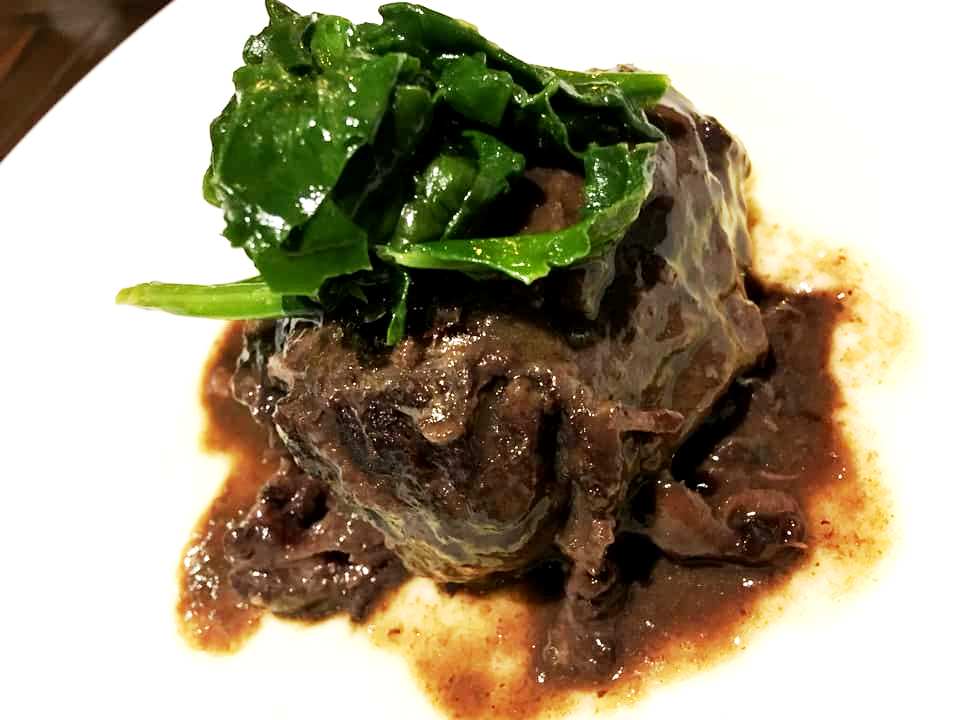 Guancia brasata al Taurasi, spinaci saltati e purea di patate