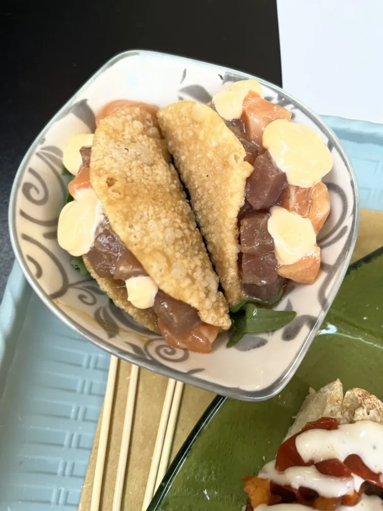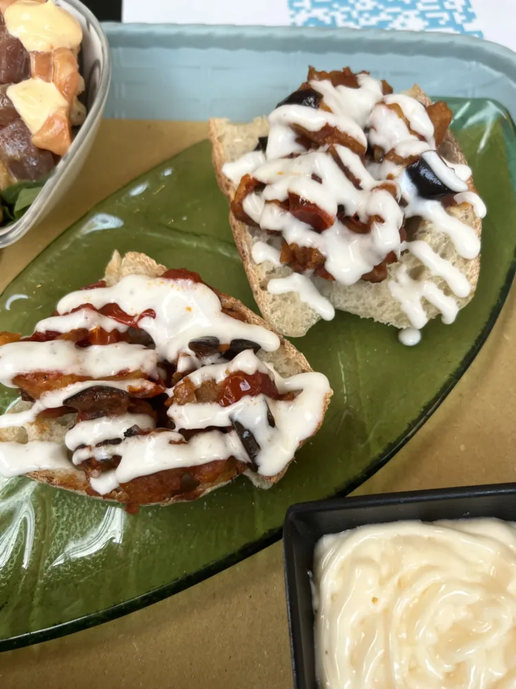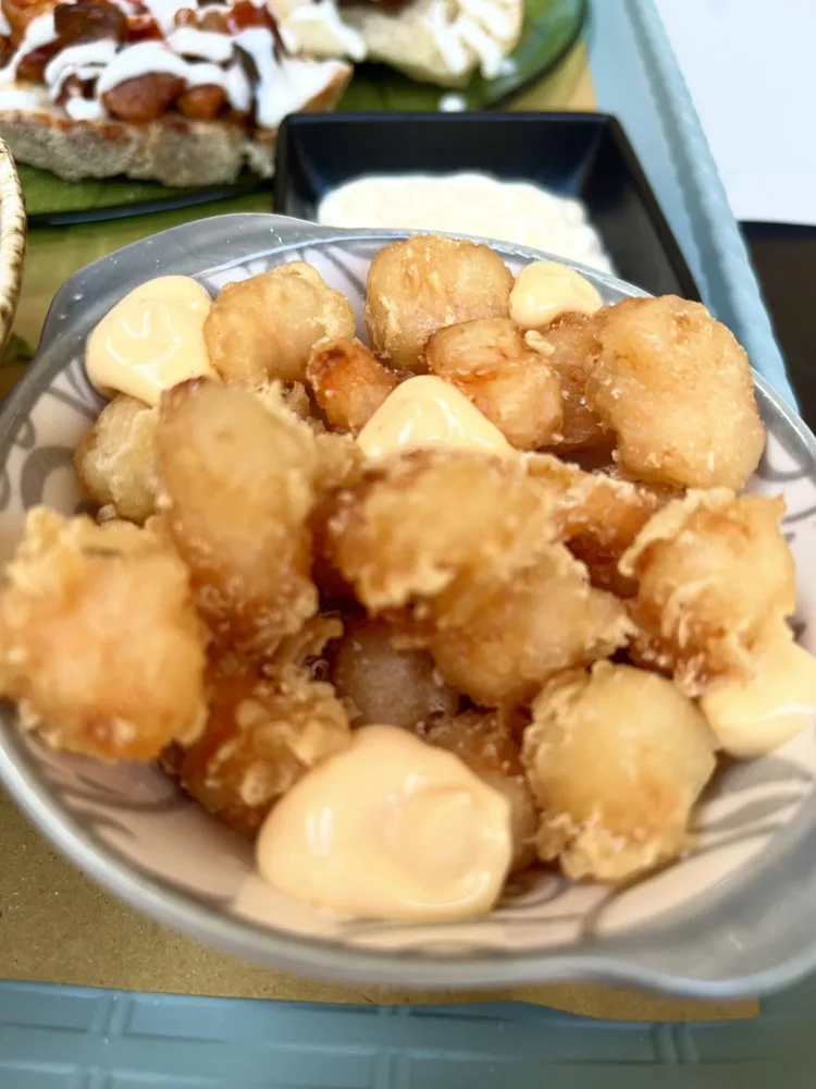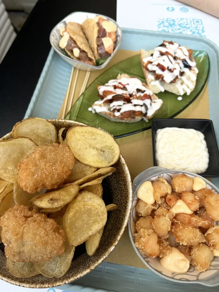 In linea di massima è rimasto tale, ma man mano l’offerta si è ampliata anche alla ristorazione, sempre con piatti a base di pesce. Come prima visita, siamo andati dritti all’aperitivo, composto da: popcorn di gamberetti, taco con pesce fresco, guacamole, salsa ponzu e spicy mayo, parmigiana di mare e fish&chips.