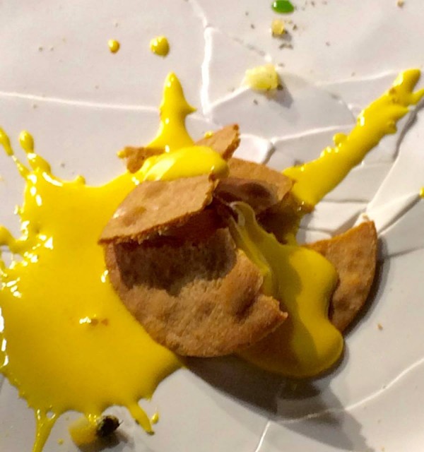 Il tema è la cottura sotto sale di tutti gli ingredienti e il risultato è molto convincente. La foto è molto eloquente, ma stupisce maggiormente la salsa di ghiande, prima tostate, poi bollite ridotte a crema e aromatizzata al rafano, tanto da sembrare una demi glace, buonissima, realizzando un piatto ricco di consistenze e di gioco di sapori dalla sapidità, al piccante, dalla morbidezza al croccante.