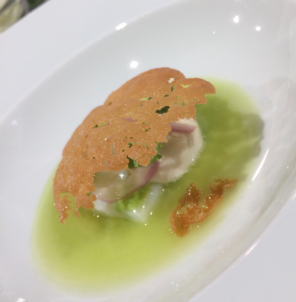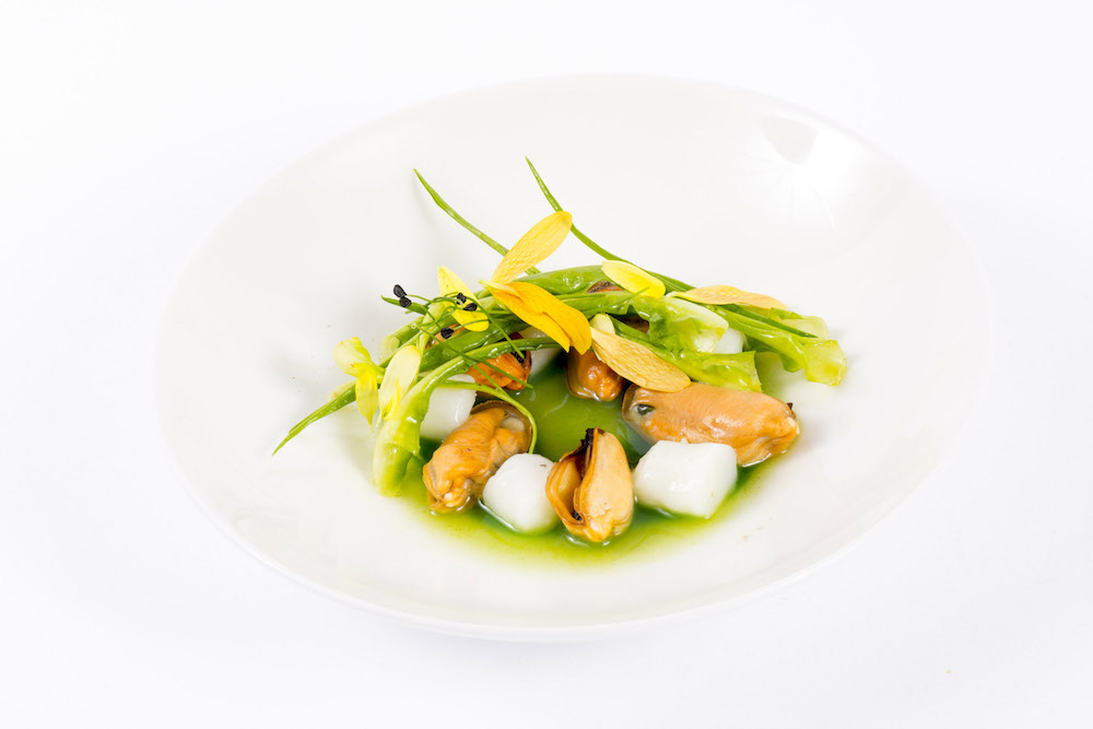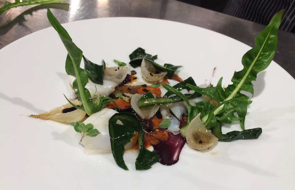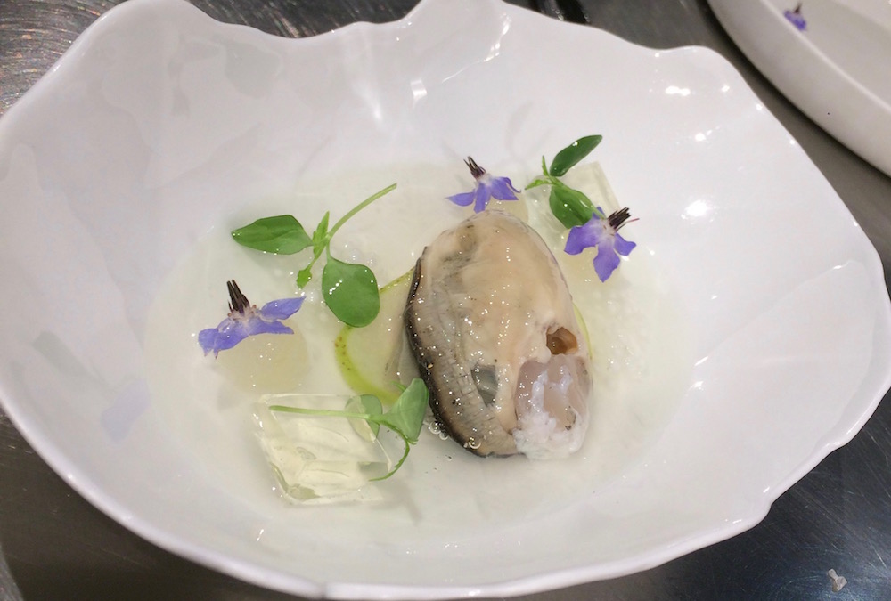 Insomma, ci sorprende tutti con una cucina essenziale, che vuole riportarci alla terra con l’utilizzo di ortaggi cotti e lavorati allo stile della carne, ridando dignità a dei prodotti poveri. Per iniziare ci prepara un piatto che lo ha reso importante ed è il più venduto nel suo ristorante, l’Ostrica e pere; raccontandoci che nasce per far apprezzare il pregiato mollusco a coloro a cui non piace e per primo a lui, e inizia una ricerca che lo porta a questo abbinamento, con succo di pere, scalogno e sidro di mele.
