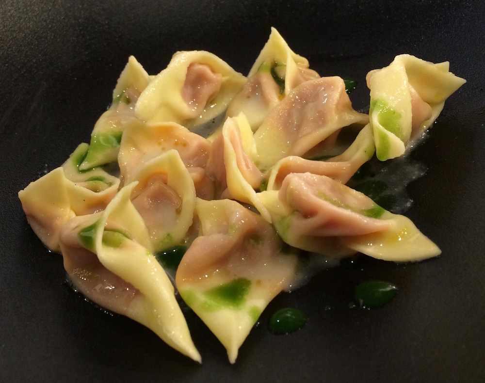 La famiglia Tinari del ristorante Villa Maiella a Guardiagrele non può che continuare a sorprenderci, prima con una cena serale in giorno precedente, di cui parlerò in seguito, e poi con due piatti sfiziosi; il primo ricalca la tradizione, ma con la provocazione della cottura: Pancetta di Maiale cotta con il consommé di gamberi. Il secondo vuole riprendere la storica abitudine di mangiare cozze nere e pecorino e nasce Gnocchi di brodo di pecorino con cozze, con cicorie. E con questi piatti c’è solo da divertirsi e giocare con il gusto, per un approfondimento serio della cucina abruzzese bisogna andare al ristorante dove troverete la madre che vi farà sognare con la Chitarrina con ragu di agnello e ricotta affumicata al ginepro.