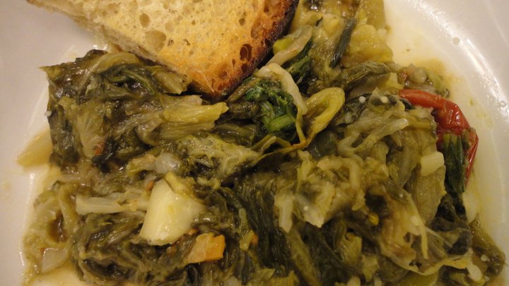 Getis Costa D’amalfi di Reale, al naso fresco e timido, ci regala un assaggio fruttato e smagliante, esaltato dai profumi dei quadrotti al limone con fiore di zucchine, assolutamente deliziosi, per giungere a un capolavoro da “standing ovation”, la minestra primaverile, con cicoria, borragine, verza, scarola incappucciata, semi di finocchietto, e un’accattivante aggiunta di caciocavallo podolico del Gargano.