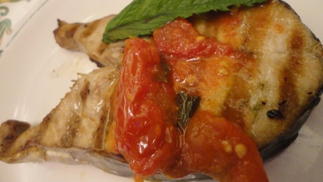 Secondo piatto, palamito in tortiera esaltato da un pomodorino del piennolo (casa barone) che dice Mimmo De Gregorio- “è come il Vesuvio, che deve scoppiare in bocca”, in abbinamento Furore Rosso di Marisa Cuomo, caldo ed elegante.