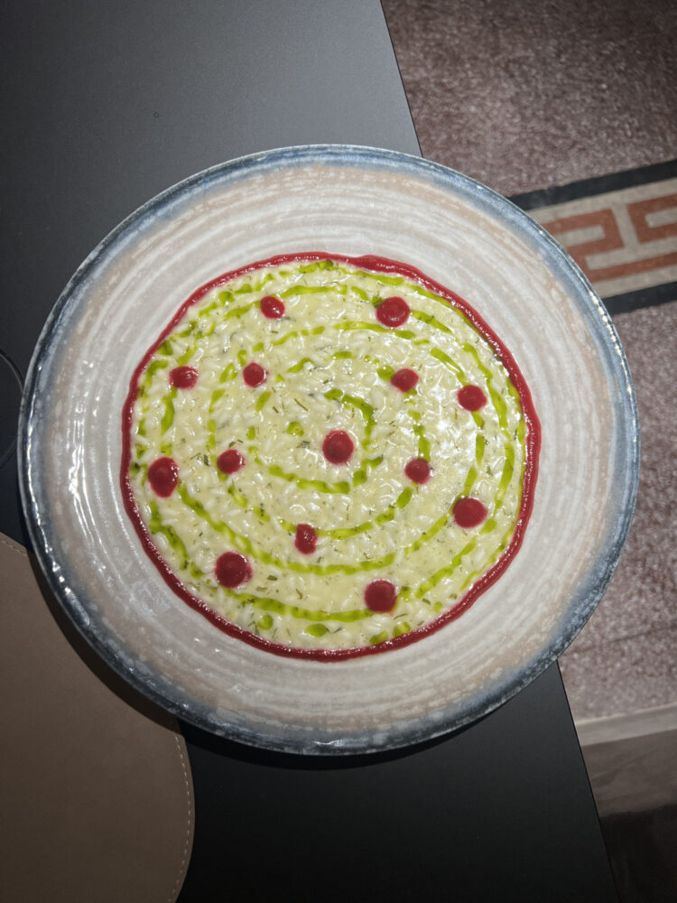 Sono poi stati serviti in coppia ai due vini restanti, cioè “Mirantur” rosso e l’Etna rosso “Grotta della Neve”, il primo e il secondo. Al naso fruttato e alla freschezza di Mirantur, un nerello cappuccio in purezza che affina soltanto in acciaio è stato abbinato un risotto alle erbe con barbabietola e olio alla cicoria.