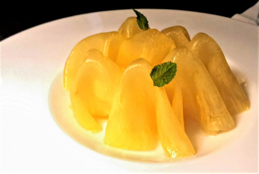 La proposta della cucina invece appare come volutamente semplificata, ineccepibile, ma solo raramente capace di innescare meccanismi di curiosità e spiazzamento, determinando un effetto distonico nelle aspettative, uno scollamento che lascia sospesi, non coinvolti fino in fondo, in un’altalena tra bellezza e malinconia paolocontiana, quella da tinello marron. E se questo straniamento dovesse invece essere l’obiettivo finale, i dolci non farebbero che sottolinearlo: prima una Mousse di cioccolato con uva fragola e noci che viene inopinatamente servita in un asessuato e mesto bicchiere, poi un Carpaccio di ananas marinato con anice stellato, che diventa emblematico, perché costruito, nudo, morbido, dorato, vellutato, postmoderno, bellissimo, buonissimo… ma pur sempre solo e soltanto un frutto, seppur mirabilmente affettato e impreziosito. Tutto molto semplice, si potrebbe dire. Pure troppo: perché la semplicità è un’altra cosa, un’altra fatica, e come tale spesso la più difficile da realizzare.