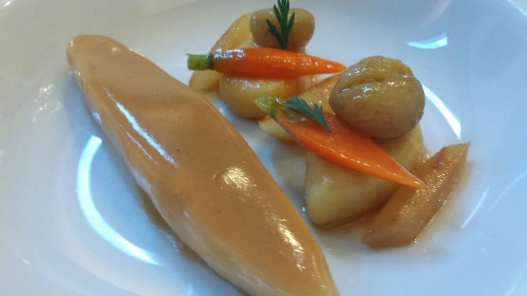 “Dacquoise al cioccolato, omaggio al Maestro Ducasse”. Il dessert è una ventata di freschezza, peraltro lieve e buonissima. Una sferzata ritemprante, una pennellata lucida e scura dopo un prolungato gioco sui toni pastello. Menu da quattro portate, forse troppo distante per prezzo e consistenza rispetto al menu da sei corse: una forbice che rischia di accendere sensi di colpa e di inadeguatezza. Eppure il viaggio è sufficiente per esser conquistati dalla precisione delle cotture e degli impiattamenti, e insieme affascinati dai movimenti decisi e compassati dei cuochi, affacciati sulla sala e illuminati di bianco, quasi in controluce: gesti di passione, promessa, personalità, di sicura consuetudine con la bellezza. Costruita però su un gusto monocorde, tendenzialmente dolce e morbido, a malapena compensato ora dall’amaro di scorza nera e carciofo, ora dall’arancia, ora dalla spuma citrina in quel granchio sopraffatto da ingombranti lenticchie all’uccelletto. Lontano, esile, ma spesso presente, un finale dal richiamo speziato. Ogni piatto porta con sé salse, fondi e verdure: colorate, croccanti, onnipresenti. Una lama di pollo si specchia compatta nella luminosa densità dell’Albuferà, arricchita dalla fuggevole bontà di piccole castagne: e ti trafigge, come il raggio di sole che penetra dalle finestre dell’antico edifizio. Ripensi agli ulivi sulla strada, ai cipressi, allo scricchiolio della ghiaia sul selciato, nel silenzio della campagna. Che non profuma di Francia, ma sempre più di Rinascimento e di Toscana. “Dacquoise al cioccolato, omaggio al Maestro Ducasse”. Ducasse chi?