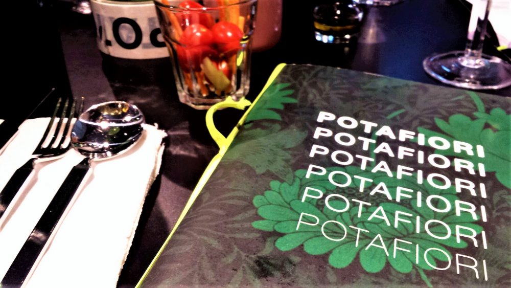 Potafiori è così: fiori, cibo e musica, l’ordine sceglietelo voi. Le piante sono dappertutto, qualche fiore reciso, tanti rami, fiori secchi, tante spine, ciotole, grembiali, vasi, in un disordine ordinato intorno a un bar e a un pianoforte, che spesso suona, la sera, o quando va a genio alla titolare, cantante professionista. Il cibo, va senza dire, si destreggia con agio tra le note e il verde, assecondando umori e passioni, tanto che il menu prevede, e mette per iscritto, una play list di canzoni italiane che prestano alcuni versi, e qualche traccia di sè, a piatti preparati con cura, belli: e non poteva essere altrimenti. Ma Potafiori è soprattutto un universo al femminile: arrivano in coppia, per parlare tra amiche, oppure a gruppi per una qualche ricorrenza. Una signora dai capelli grigi pranza da sola: sembra la conoscano, prende un piatto di verdure, una insalata di ortaggi e se ne va. All’uscita le regalano un fiore.