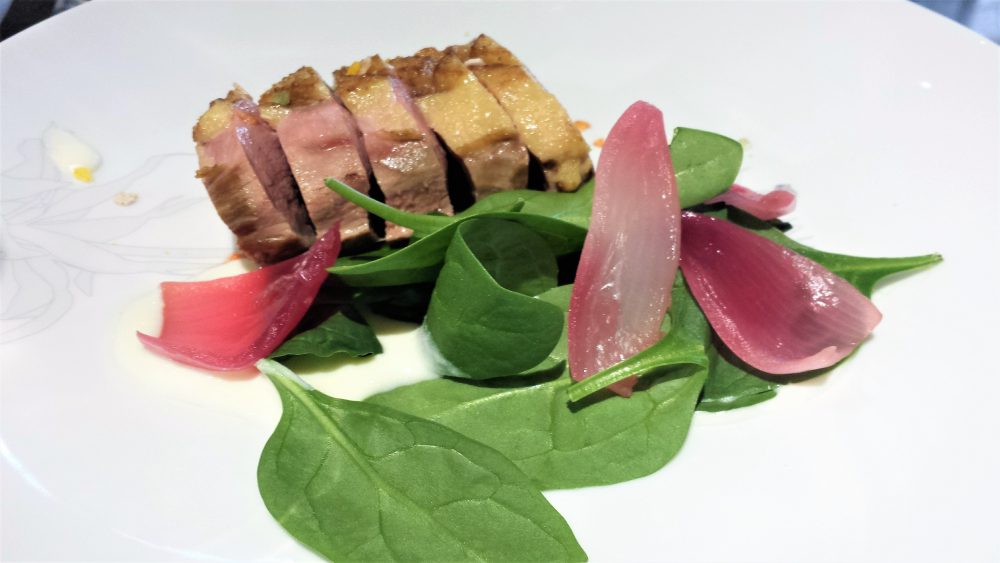 Potafiori – Petto d’anatra di Barberia, crema di burrata, cipolle rosse in agrodolce, spinacino