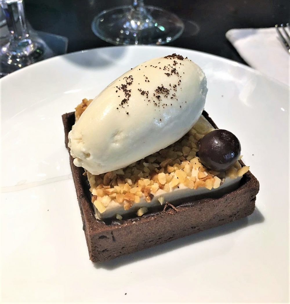 Potafiori – Namelaka al caffe’ e cioccolato bianco, frolla al cacao, gelato alla nocciola delle Langhe