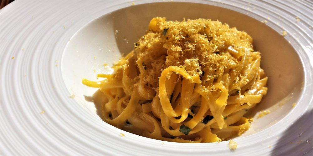A questo devono aver pensato i titolari del Giglio a Lucca, un ristorante di tradizione in pieno centro all’interno delle Mura, quando il loro figliolo ha preso in mano le redini della cucina insieme a due suoi amici e colleghi: noi vi sosteniamo, ma un passo alla volta. E io, per parte mia, due anni fa avrei dovuto sapere che qualche bel piatto ben fotografato e un premio nazionale a uno stratosferico Spaghetto alle vinacce e fegato di colombaccio, non potevano essere sufficienti a ribaltare una linea consolidata da decenni. Così trovai una carta confusa, non leggibile, qualche buon piatto e poco o nulla di quanto avrei voluto assaggiare: forse le novità erano confinate a un menu degustazione a mano libera al quale già allora mi mostravo recalcitrante. Colpa mia. Ma dello spaghetto neanche l’ombra. Rimasi deluso, appesantito da moquette e tendaggi d’antan, da tavolate di stranieri schiamazzanti, da tavoli molto ravvicinati, da una rotazione assidua, incalzante, pur sotto la guida premurosa dei responsabili di sala. Ragazzi, i numeri sono numeri, e prima di fare salti in avanti occorre cercare un nuovo punto di equilibrio (devono essersi detti).