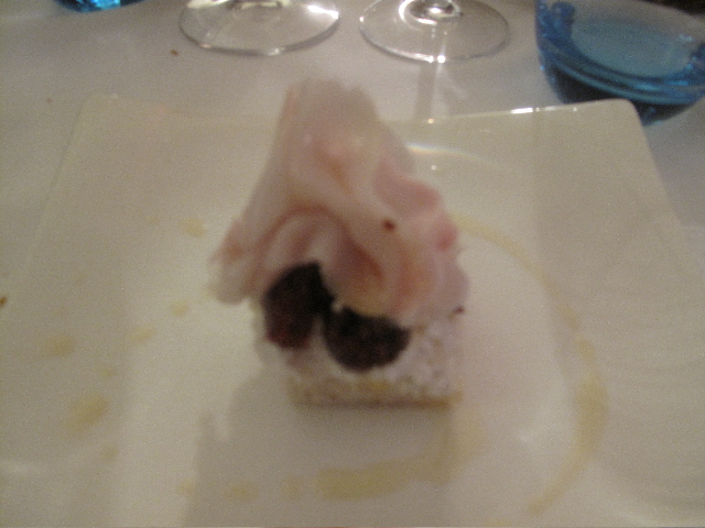 Benvenuto di pane cafone con fiore di ricotta di bufala, baffo di lardo di nero casertano e pomodorino strabaciato dal sole. Vedete: anche questa è solo materia ma la differenza fra il cavese e qui, per esempio, è il pane: là una fetta di pane secco e buttato lì, qui lo si è curato quanto il companatico: fragrante il giusto, circonciso ai fianchi, tagliato di fresco. Insomma l’hanno guardato, massaggiato e portato in tavola. Si chiama cura, poi le materie utilizzate faranno il loro corso, e cchecavolo!