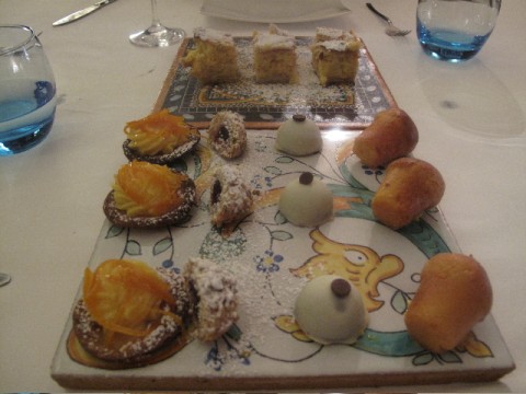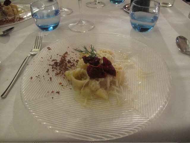 Veniamo simpaticamente assaltati dal competentissimo sommelier Domenico Sarno (capisce anche di orologi, cosa rara nel suo mondo di talebani del sentore di…..) e scortati ad un magnifico tavolo spazioso, già atto quindi alle arrembanti successioni di piatti.