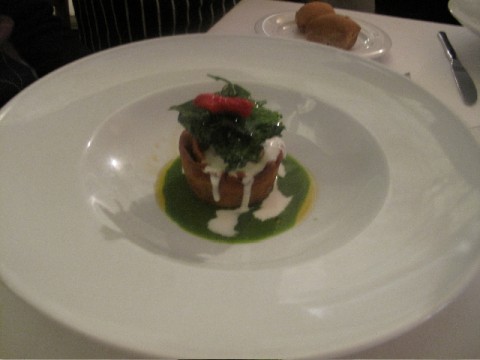 PANZEROTTO DI PATATE SU SALSA DI BUFALA- MILLEFOGLIE DI PATATA E BUFALA SU KECTUP DI SAN MARZANO-CILEGINA DI BUFALA IN TEMPURA ROSSA SU SALSA AQL BASILICO