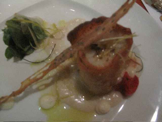 Non indimenticabile piatto . Anch’io non ne posso più di pesce in abbinata a formaggi a vario titolo. Qui l’aggravante  è quel truciolo di pane e acciughe ,dichiarato  dal cuoco “pane di fieno “ che a me è parso , più terra terra , a retrogusto stranamente glutammatico. Fare da mangiare per centcinquanta persone resta un bell’azzardo, sempre.